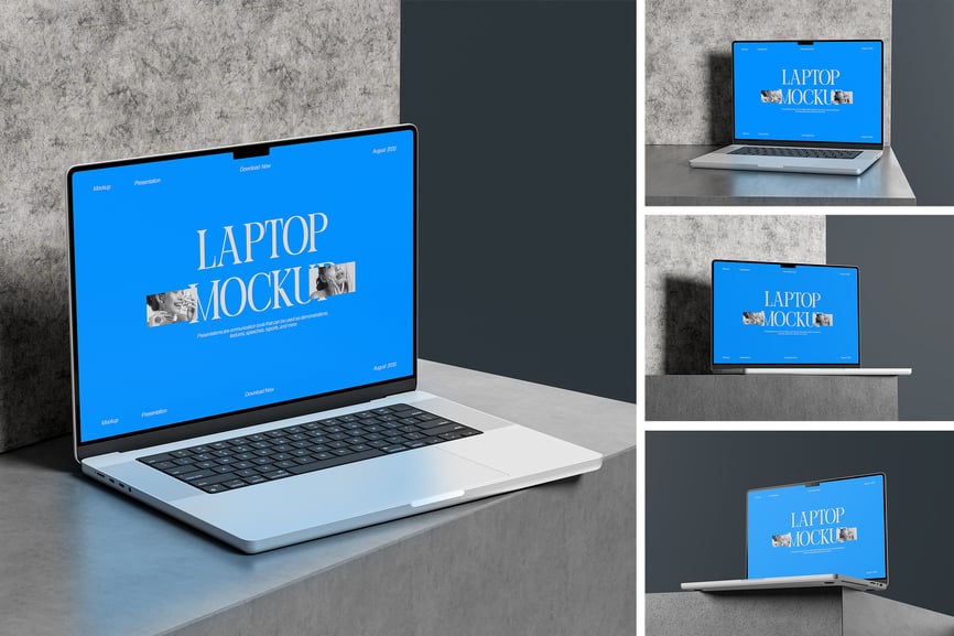 用这些精美的样机展示您的笔记本电脑样机设计。此样机包含 4 个项目,并提供分层清晰的 PSD 文件。此外,此样机还采用了智能对象功能,这意味着您只需几秒钟即可轻松快捷地将当前设计替换为您自己的设计。