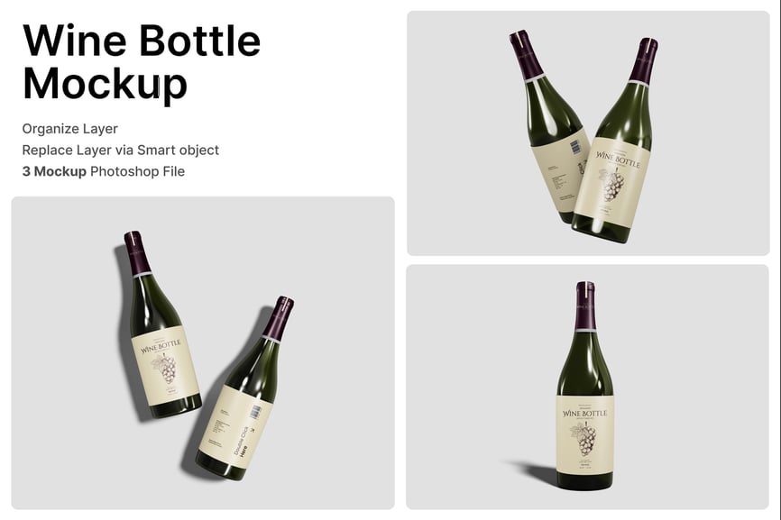 这款葡萄酒瓶样机是一款高级 Photoshop 模板,旨在以简洁逼真的方式展示葡萄酒标签设计、饮料品牌形象和产品包装。它包含三个高质量的 PSD 场景,捕捉了优雅的瓶身造型、自然的反射效果和精致的光照,打造出逼真的产品可视化效果,适用于现代和经典葡萄酒品牌。