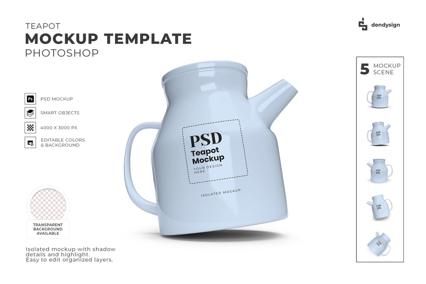 这款茶壶样机模板能以精致逼真的方式展示您的茶叶品牌、标志或定制图案设计。该套装包含 5 个高分辨率 PSD 样机文件,展示了一款优雅的茶壶,并提供多个角度的展示。模板采用智能对象设计,方便您快速自定义,轻松插入您的设计、调整颜色和控制阴影。是茶叶包装展示、厨具品牌推广和产品宣传的理想之选。