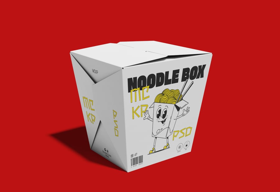 这款面条盒样机展示了一款逼真的外卖食品包装设计,采用经典的折叠纸面盒结构。盒子造型经典,具有倾斜的侧面、折叠的顶部翻盖和紧凑的方形底座,清晰地展示了正面、侧面和顶部的品牌标识区域。样机提供多种视角,展示了盒子的闭合和部分打开状态,方便用户详细查看图形、图标和文字的布局。此样机提供高分辨率 PSD 文件,并带有智能对象图层,可快速准确地进行自定义,同时保留逼真的阴影、折痕和材质深度。