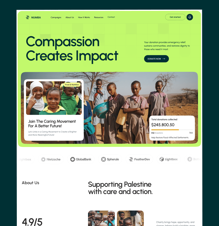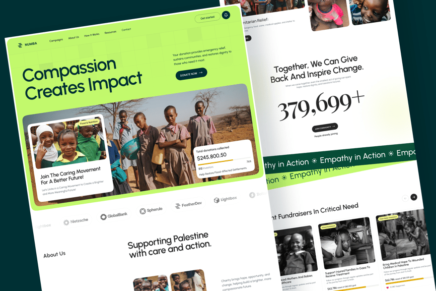 Numba 是一款捐赠网站首页 UI 套件。首页包含 7 个部分:首页介绍、关于我们、我们的使命、加入社区、紧急筹款活动、常见问题解答和页脚。