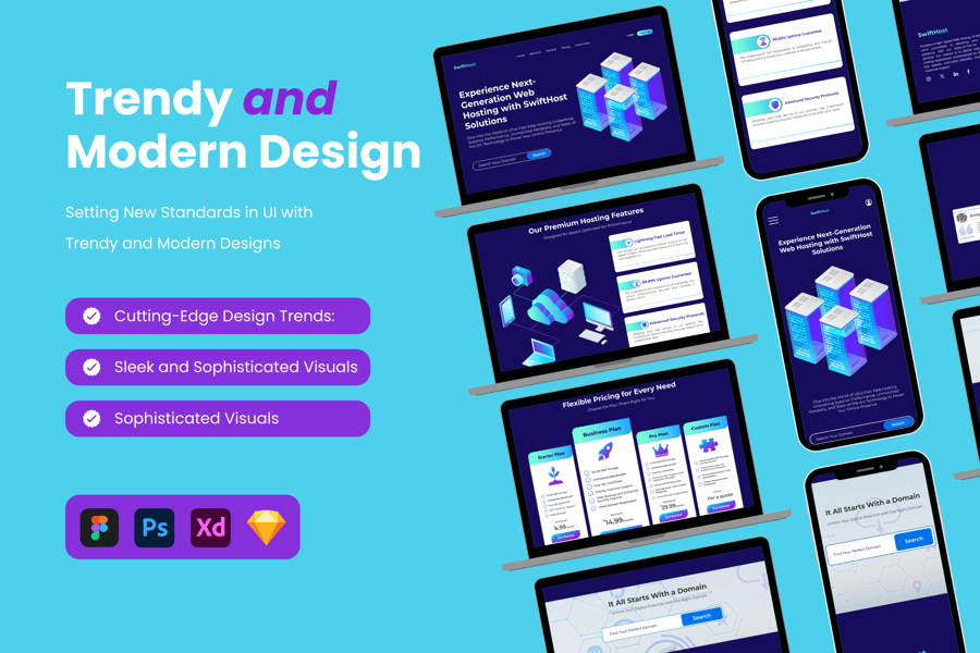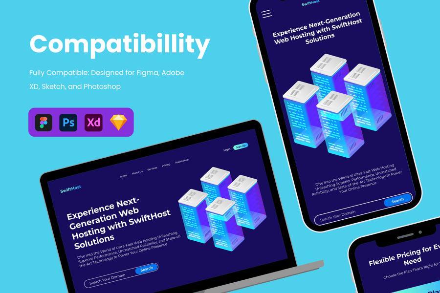 该模板兼容Sketch、Adobe XD、Figma和Photoshop等主流设计软件。这种多功能性使设计师能够使用他们偏好的工具,并将模板无缝集成到工作流程中。