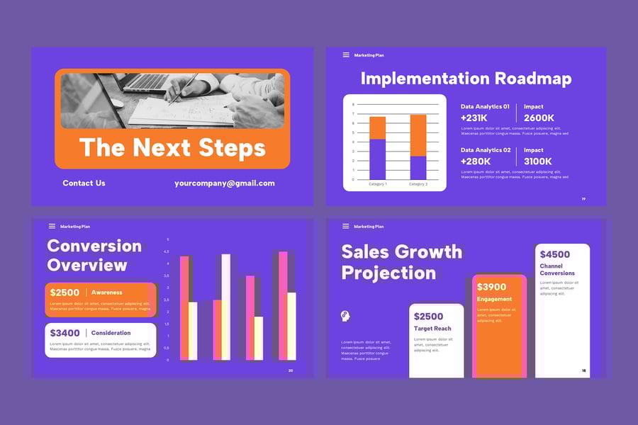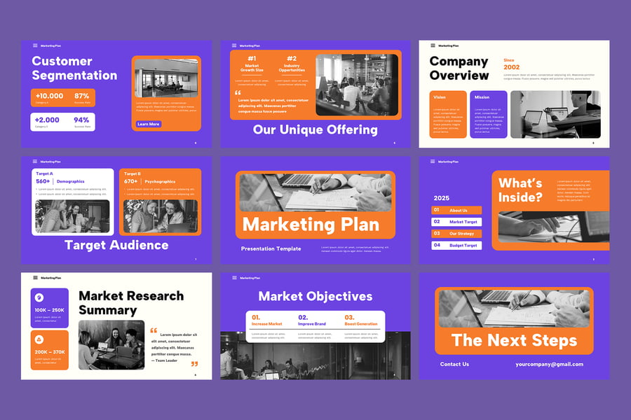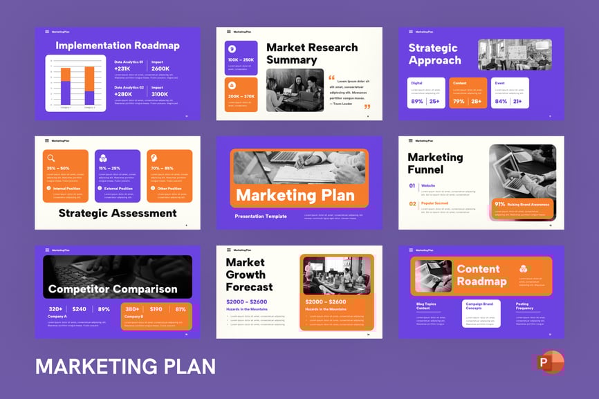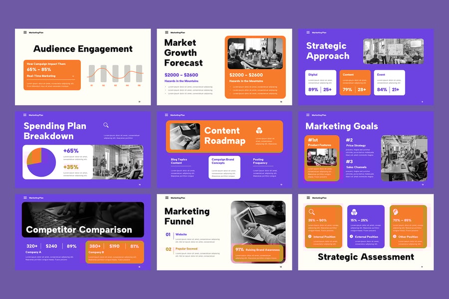 使用这款营销计划 PowerPoint 模板,清晰自信地展示您的业务增长战略。该模板专为营销人员、企业主、代理机构和公司团队设计,旨在帮助他们有效地传达营销目标。模板提供结构化的布局,突出显示市场调研、目标受众细分、品牌定位、价值主张、营销活动策略、内容规划、潜在客户开发、销售漏斗、关键绩效指标 (KPI) 和预算分配等关键领域。