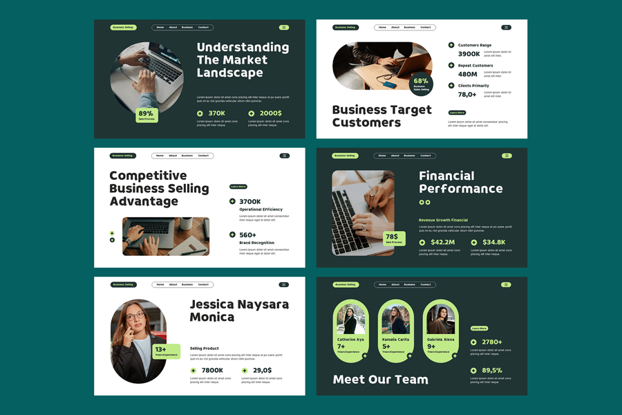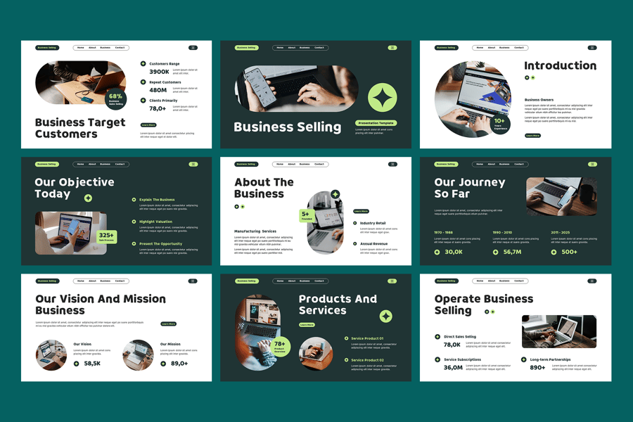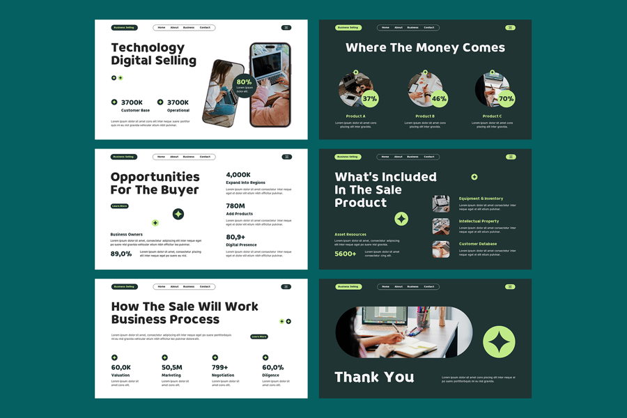 这款模板采用简洁专业的现代字体设计,布局清晰,视觉效果以商业为导向,每张幻灯片都可用于展示图表、信息图、收入趋势、财务报表、竞争对手对比和运营流程图。视觉占位符能够清晰有力地展示资产、产品组合、关键人员和战略机遇。该模板适用于企业出售提案、投资者演示、收购会议、公司谈判和利益相关者简报,确保您的企业销售演示具有说服力、可信度和视觉冲击力。