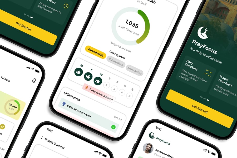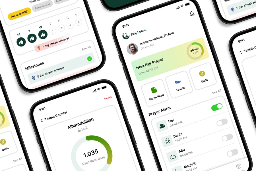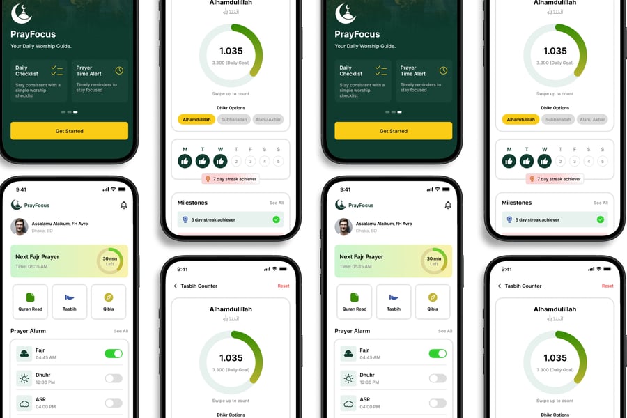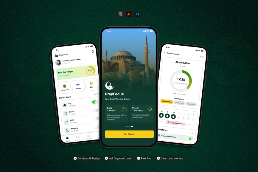 **Islamic Companion** UI 套件的设计注重易用性和一致性,让您轻松创建美观实用的移动应用程序。每个元素都经过精心构建,完全可定制,并可根据您的品牌进行调整。无论您是设计社交应用、电商应用还是效率工具,此套件都能让您灵活地将创意变为现实。