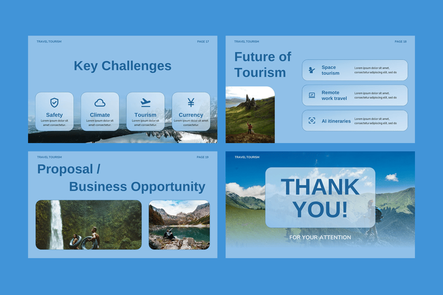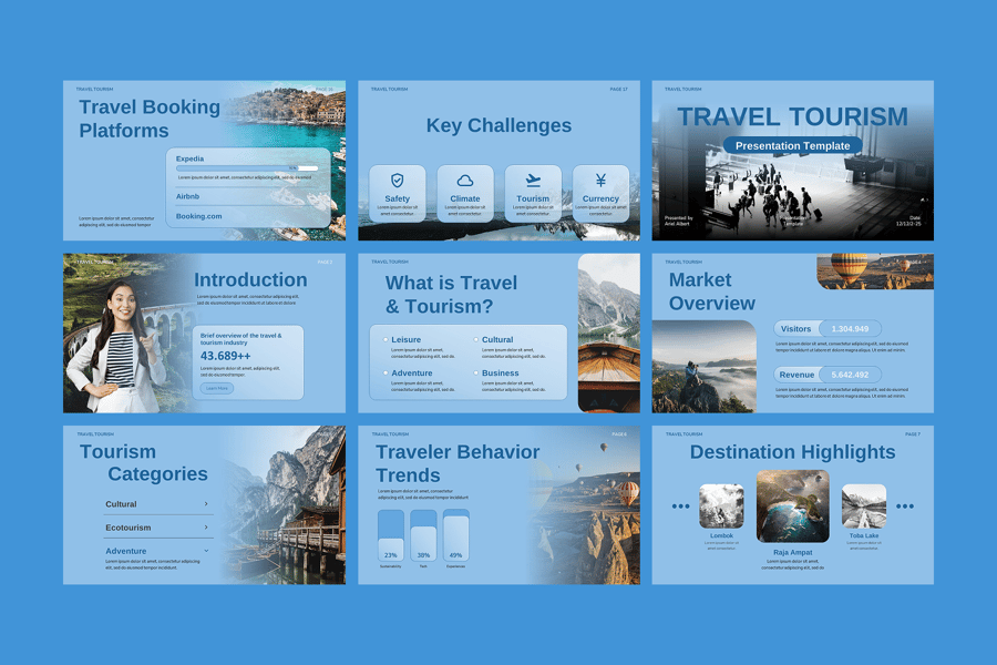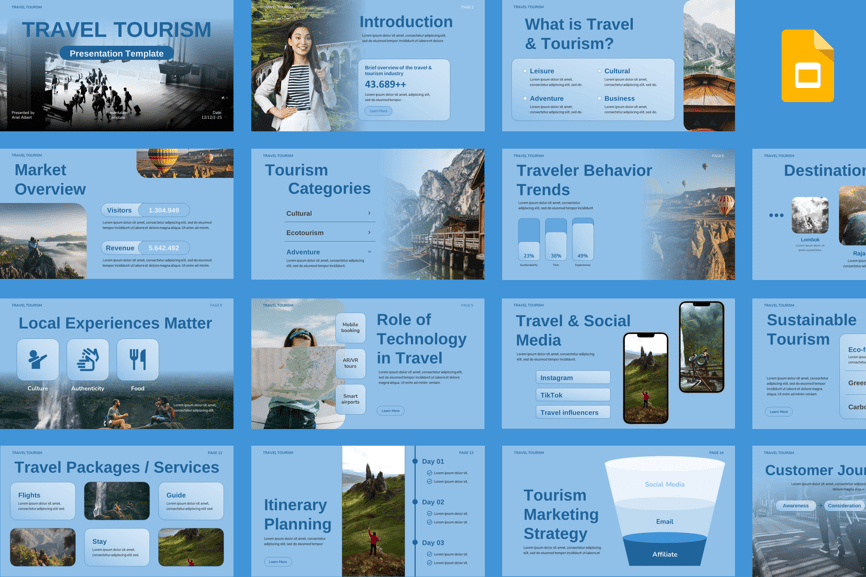 探索这款旅游主题的谷歌幻灯片演示模板,它采用现代专业的设计,是旅行社、旅游运营商、度假策划师、酒店和目的地营销人员的理想之选。该模板通过简洁的布局和精美的视觉效果,助您展示旅游套餐、突出目的地亮点,并激发人们的旅行热情。凭借独特的幻灯片、完全可编辑的元素和基于矢量的信息图表,这款模板是制作引人入胜的旅游推介、旅游商业计划书或宣传资料的完美之选。其设计融合了优雅的字体、世界地图图形和照片占位符,为您的观众打造极具视觉冲击力的体验。