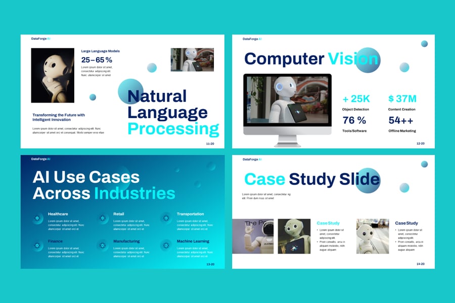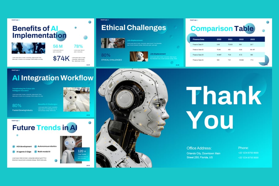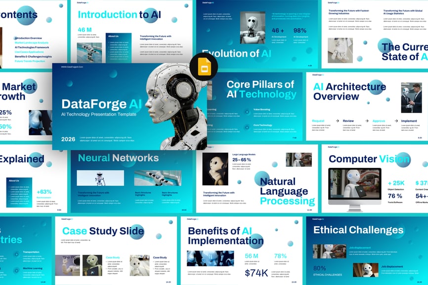 现代人工智能、数据与创新演示文稿,AI 技术 Google Slides 演示模板是一款现代、简洁且充满未来感的演示文稿,专为科技公司、初创企业、AI 开发人员、数据科学家、IT 专业人员和业务团队而设计。此模板可帮助您以引人入胜且易于理解的方式,清晰地展示人工智能概念、机器学习解决方案、数据驱动的洞察、自动化策略和未来技术趋势。