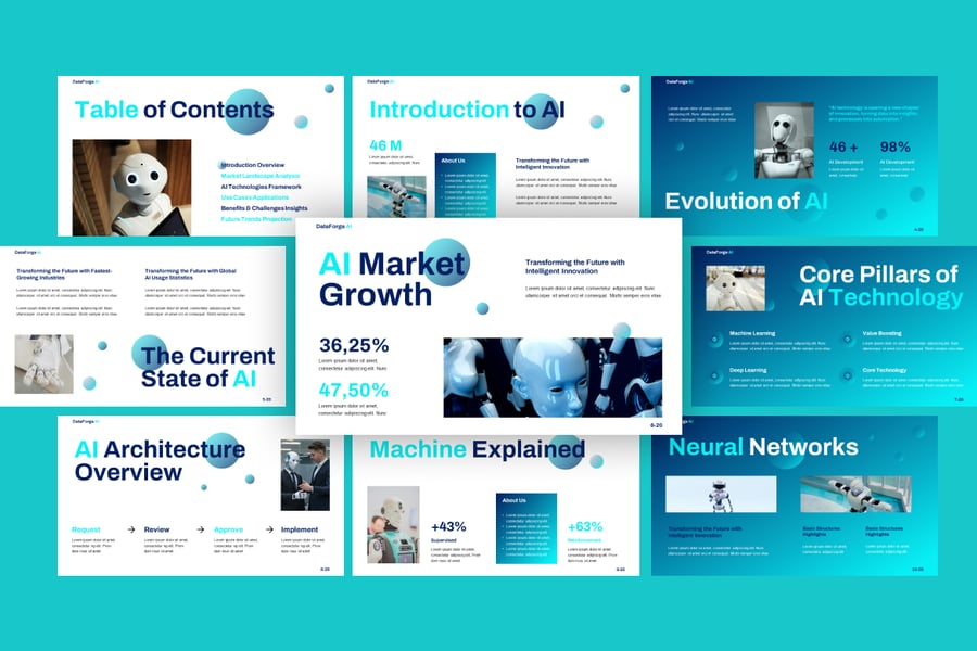 这款模板完美适用于人工智能产品演示、技术推介、创新会议、数字化转型展示、研究简报和初创公司演示文稿,助您清晰有力地传达复杂的技术理念。完全可编辑的幻灯片和结构化的布局,让您轻松快捷地进行自定义。无论您是展示人工智能模型、工作流程、算法、用例还是业务影响,这款人工智能技术模板都能确保您的演示文稿看起来专业、创新且具有前瞻性。