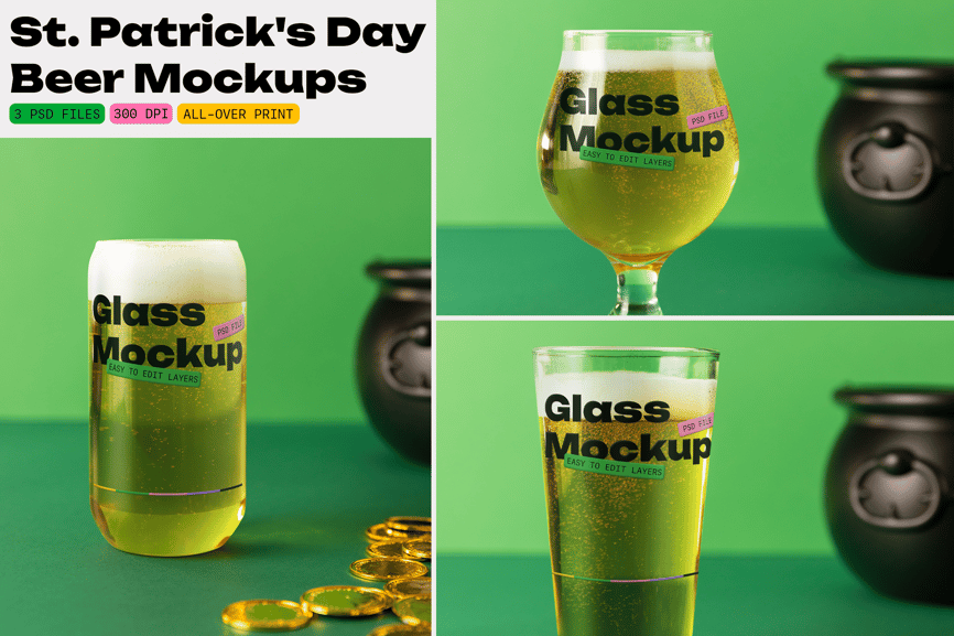 用我们独家推出的啤酒杯模型系列庆祝圣帕特里克节吧!该系列包含三款高分辨率 PSD 场景,均取材于真实照片,呈现出活力四射的节日美感。每个文件都包含分层智能对象,方便您轻松自定义饮料品牌、标签设计或宣传素材。300 DPI 的分辨率确保您的设计清晰锐利、专业美观,完美适用于客户演示、在线作品集或营销材料。此外,我们还提供便捷的 PDF 指南,助您轻松编辑,享受流畅的体验。