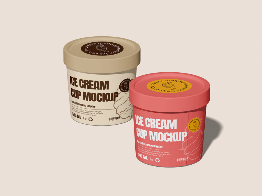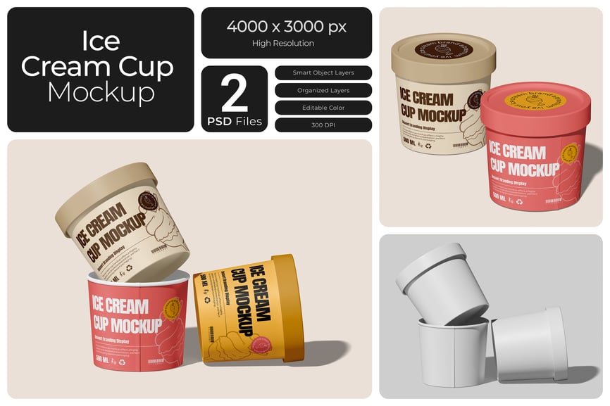 这款**冰淇淋杯样机**设计精美,风格高端又不失趣味,让您的冷冻甜点品牌脱颖而出。**这款样机非常适合用于手工意式冰淇淋、冻酸奶或咖啡馆外卖包装**,提供高质量、可编辑的正面视图。