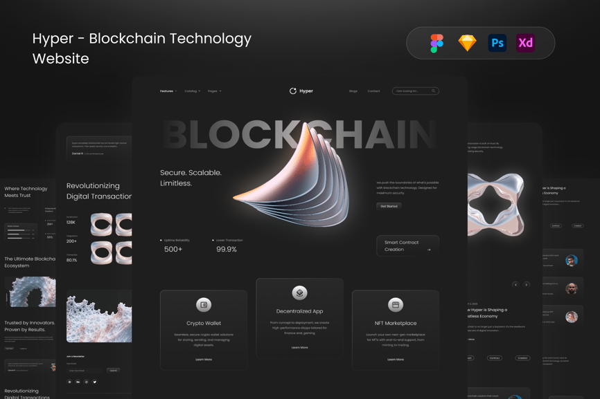 *Hyper – 区块链技术网站* 此模板简洁却不失专业现代感。您可以使用 Figma、Adobe XD、Sketch 和 Adobe Photoshop 进行编辑。轻松插入内容、更改颜色,所有模板均已包含在内,可直接与您的受众分享。所有组件均基于矢量图,完全兼容、可编辑且像素级精准。此外,它们组织有序、命名清晰、分组合理。