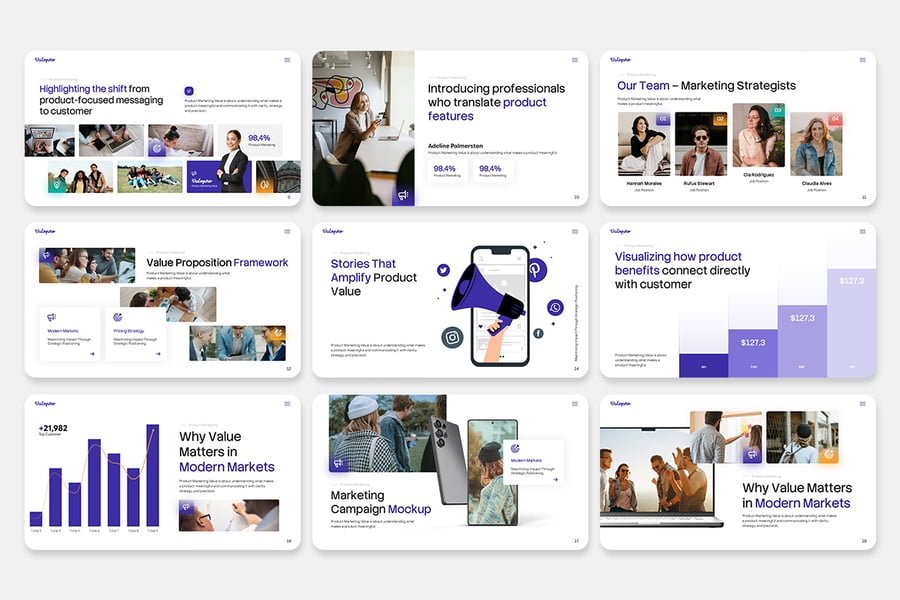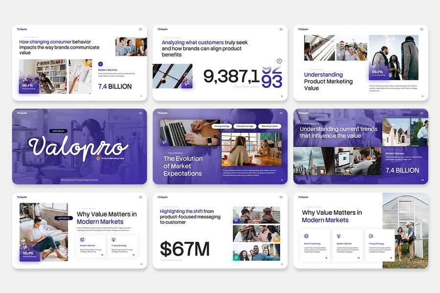 **产品营销价值演示 – 商业营销 PowerPoint 演示文稿** 使用“产品营销价值”PowerPoint 模板,提升您的演示效果。这款模板功能多样、创意十足且设计简洁,专为企业和个人用户打造。它融合了现代美学与专业气质,是任何希望给客户或利益相关者留下深刻印象的人士的理想之选。凭借其灵活的风格和简洁的设计,“产品营销价值”能够提升您的演示质量,使其成为有效传达理念和提升客户参与度的必备工具。
