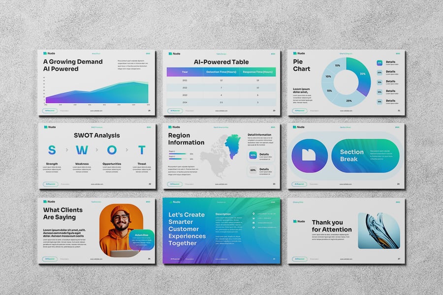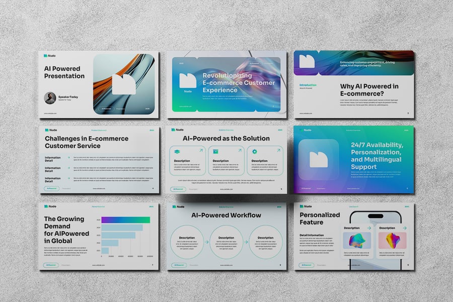适用范围:人工智能与科技初创公司、软件与SaaS公司简介、产品发布与演示、投资者推介PPT与商业计划书、内部战略、创新与数据报告、人工智能驱动解决方案的客户演示、现代商业模板、初创公司品牌推广、业务概览幻灯片、商业计划书和企业技术规划等。