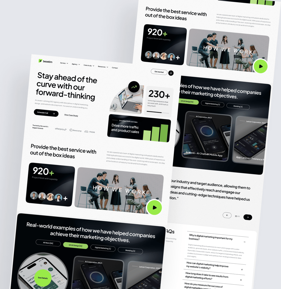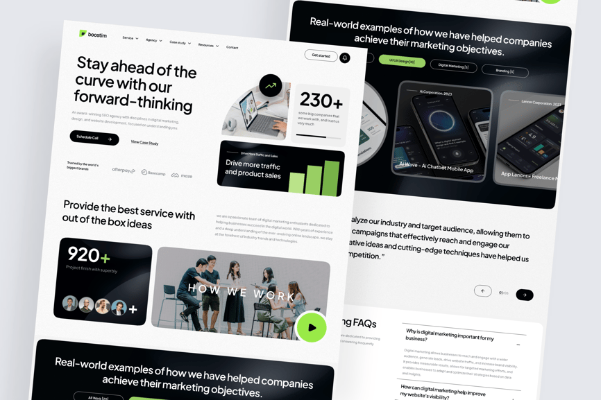 Boostim 是一款数字营销机构落地页 UI 套件。首页主页面包含 7 个部分,分别是:首页主页面、最佳服务、功能介绍、客户评价、常见问题解答、服务介绍和页脚。
