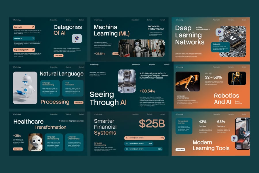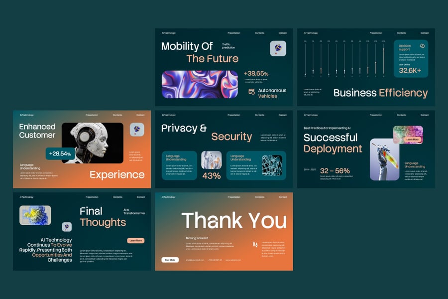 这款演示模板非常适合科技初创公司、IT公司、人工智能产品发布会、研究报告和技术路演,助您以时尚的方式呈现数据驱动的理念。它包含完全可编辑的图形,支持数据可视化——图表、示意图、时间轴、思维导图、信息图等等。