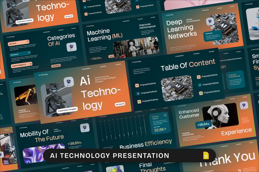 使用这款专为专业人士打造的 AI 技术 Google Slides 演示模板,让您的下一场技术演示更加精彩。该模板旨在帮助您清晰、直观地展示前沿概念。其简洁而充满未来感的布局灵感源自人工智能、机器人、数据科学、机器学习、网络安全和数字创新等领域。