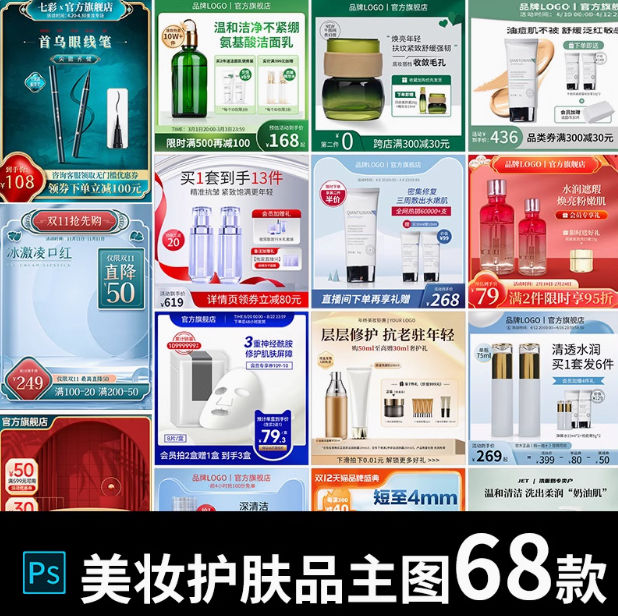 为电商领域的美妆护肤品类特别设计的PSD设计模板,这套素材包含68款专业模板,适用于天猫、淘宝、京东等主流电商平台的主图、首图以及直通车广告设计。这些模板以其精致和吸引人的视觉设计,帮助商家提升产品的在线展示效果和吸引潜在顾客。