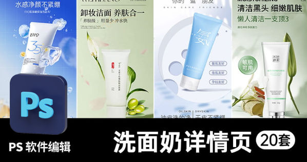 针对电商领域中护肤和洁面产品的详情页设计需求,这套PSD设计素材提供了20套专为淘宝平台设计的护肤卸妆洁面乳和男士氨基酸洗面奶详情页长图模板。这些模板以其专业和吸引人的设计,帮助商家在电商平台上更有效地展示产品特点和优势。