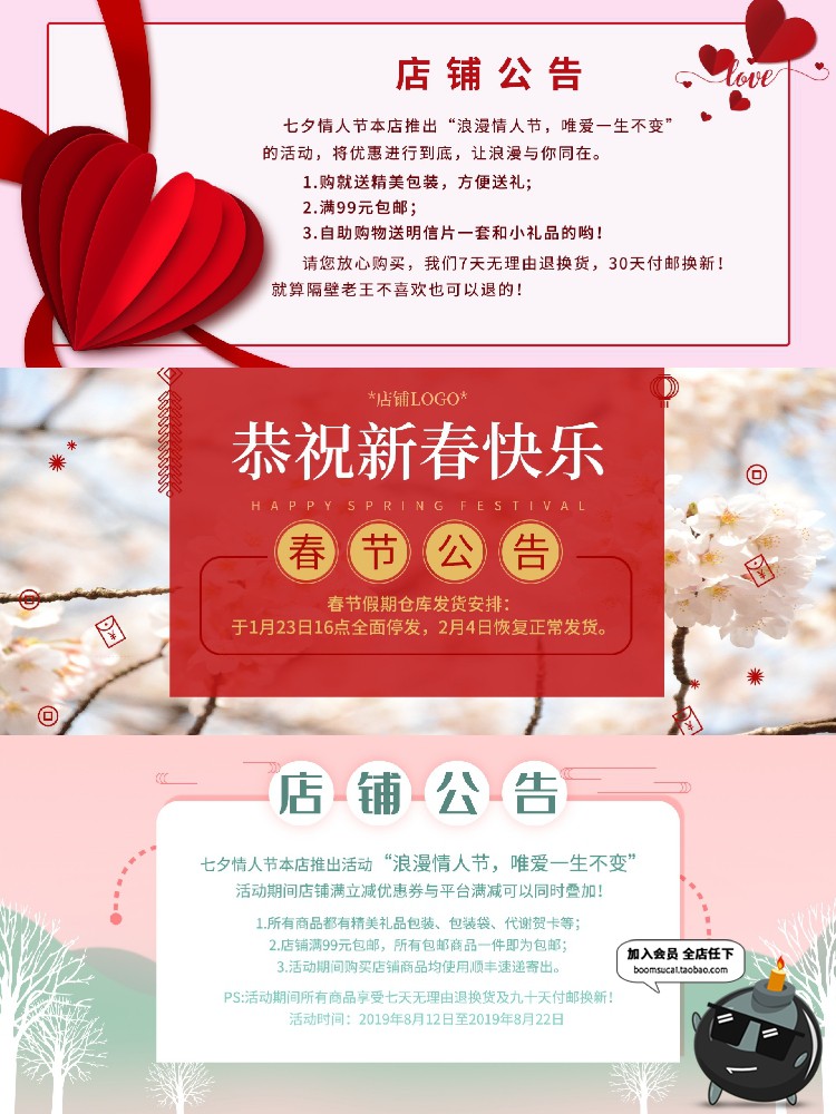 50款店铺首页海报发货说明放假通知公告栏买家需知PSD模板设计PS素材 电商装修 25年2月17日 编辑 前往下载 语梦金牌服务官 取消关注 关注 私信 素材格式:PSD模板 文件数量:50款 文件大小:1.04GB 素材尺寸 :1920像素*900像素 软件信息 :Photoshop软件使用 特殊备注 :附带预览图,可单独下载 素材编码:746K 下载权限查看 ¥ 免费下载 评论并刷新后下载 登录后下载 查看演示 {{attr.name}}: 您当前的等级为 登录后免费下载登录 小黑屋反思中,不准下载! 评论后刷新页面下载评论 支付¥以后下载 请先登录 您今天的下载次数(次)用完了,请明天再来 支付积分以后下载立即支付 支付以后下载立即支付 您当前的用户组不允许下载升级会员 您已获得下载权限 您可以每天下载资源次,今日剩余次